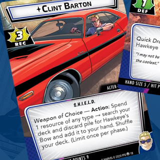 Tommy: Clint has the standard expected hand size, as well as his hero form of Hawkeye, of 6 and 5. The 9 HP is low but thematically makes sense. Clint has the ability to grab his bow from the deck or discard pile for the cost of a resource. Hawkeye has 1 THW, 2 ATK, and 1 DEF, as well as the ability to exhaust himself to ready his bow. Its hard to gauge how good that ability is right now with so little information of what’s in his signature 15. Now, I know we’ve seen quite a few characters that have significant items that they can start with, or are just actually built around, but I think it feels right to have this character in particular built around this weapon.
